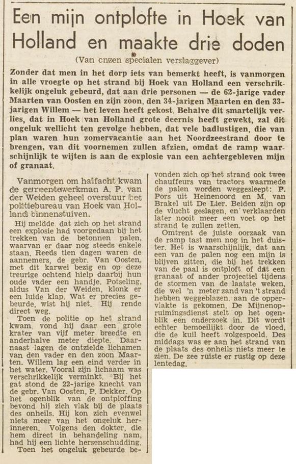 Op 18 maart 1947 zijn Van Oosten en zoons nabij het Oude Slag op het strand van Hoek van Holland bezig met het verwijderen van de obstakels. Op het moment dat er met behulp van een tractor, een stalen paal wordt verwijderd, is er een geweldige explosie. Vader Maarten (62), zoon Willem (34) en Maarten jr. (33) zijn op slag dood. Van de toeschouwers die staan te kijken, raakt er één ernstig gewond.