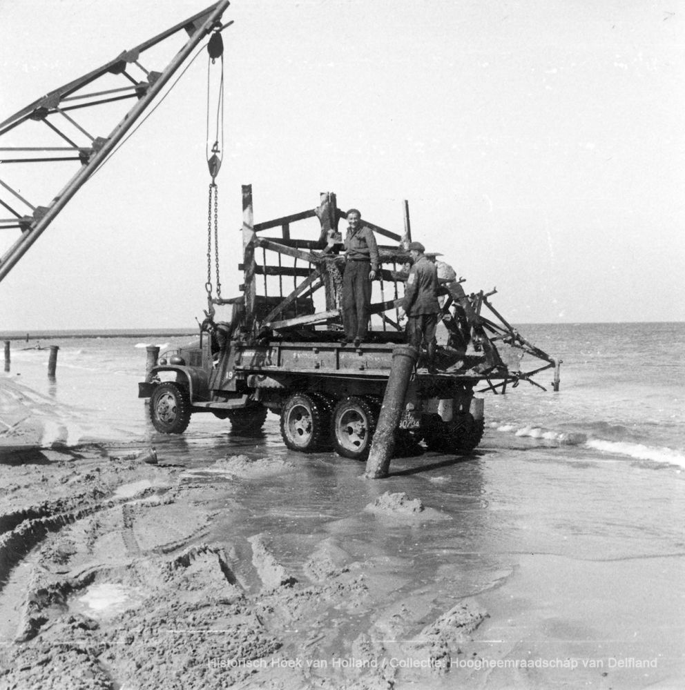 Het ruimen van versperringen (met mijnen) op het strand van Ter Heide in 1947 door aannemingsbedrijf Sanders-Snepvangers en Vlieger (Hoogheemraadschap van Delfland)